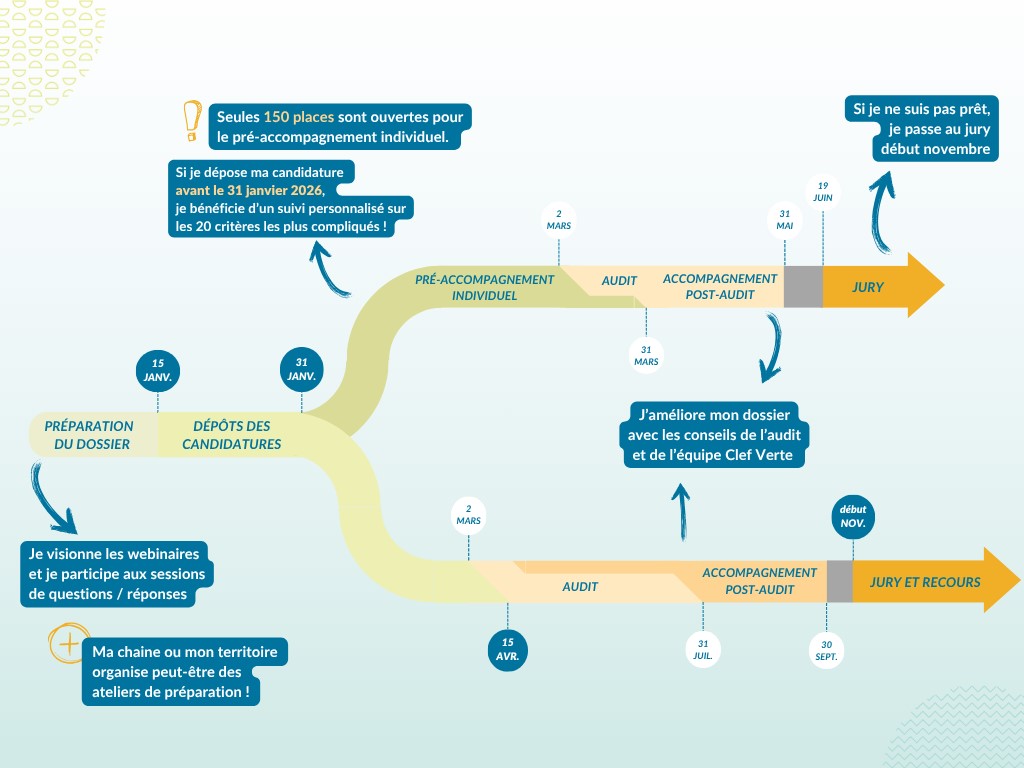 - Du 15 janvier au 15 avril : envoi du dossier de candidature. Un envoi avant le 31 janvier permettra aux établissements de bénéficier d’un pré-accompagnement individuel en février-mars (dans la limite de 150 établissements)